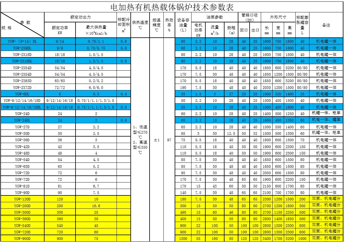YGW系列電加熱有機熱載體鍋爐(俗稱油加熱器)是一種以有機熱載體為傳熱介質,以冷卻水(軟化水)或空氣為換熱降溫介質,采用電加熱升溫,通過熱油泵強制循環的供熱和調溫設備。